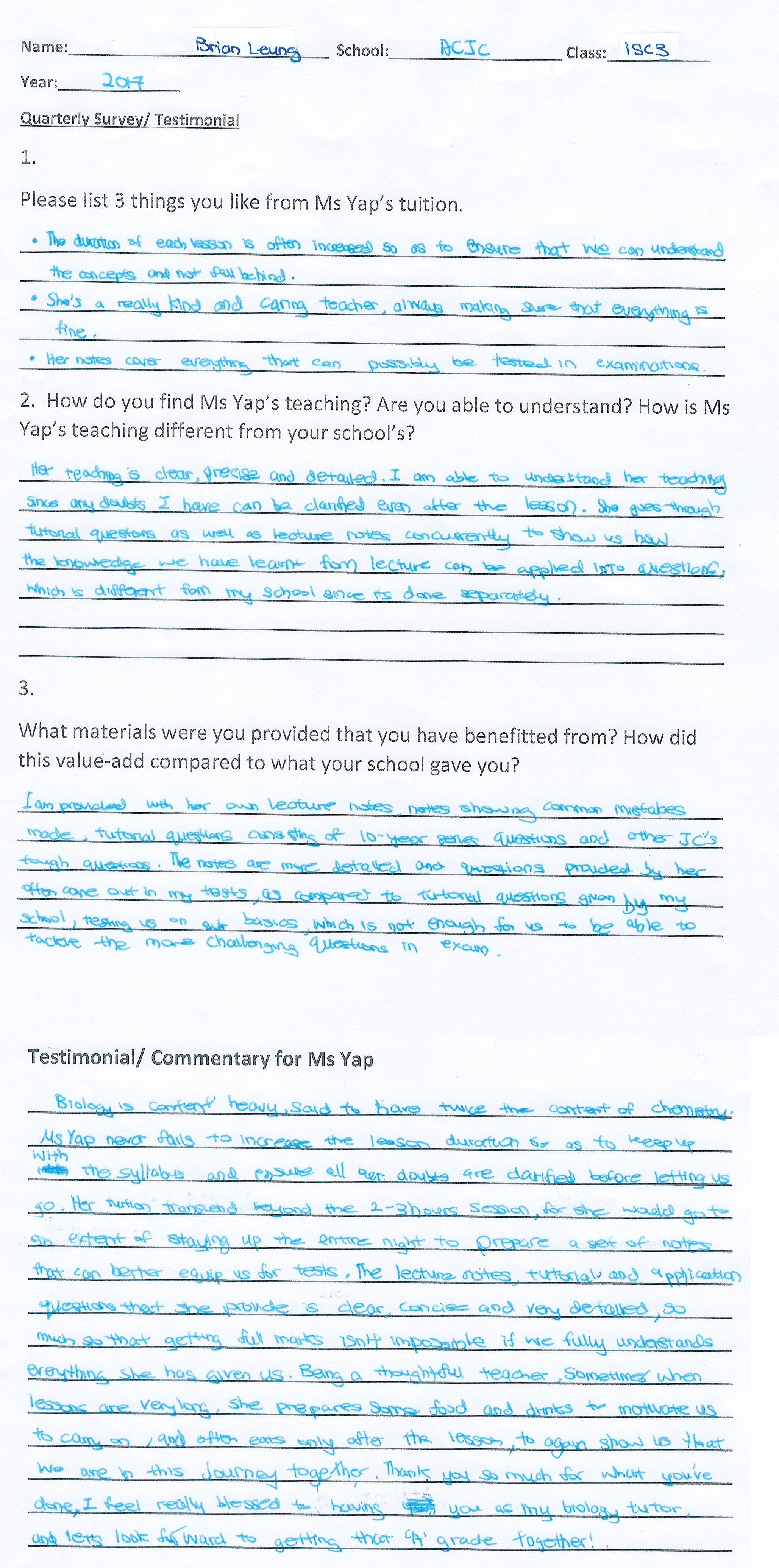 “Ms Yap teaches more than my school and another tuition centre, which is very helpful for Paper 3. She taught me how to study Biology efficiently. (I topped my class and scored “A”! )” Brian is currently pursuing Medicine in NTU (2019)