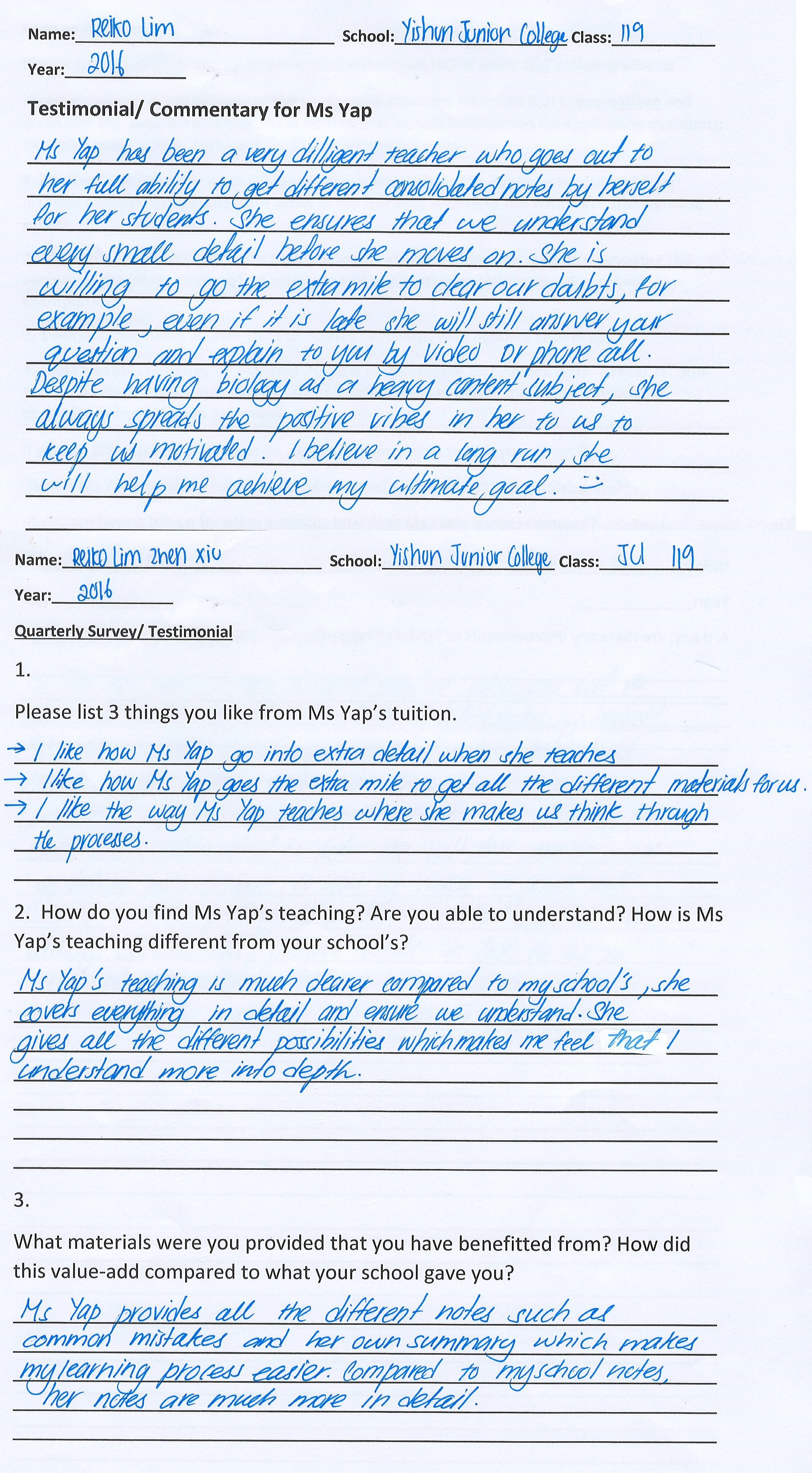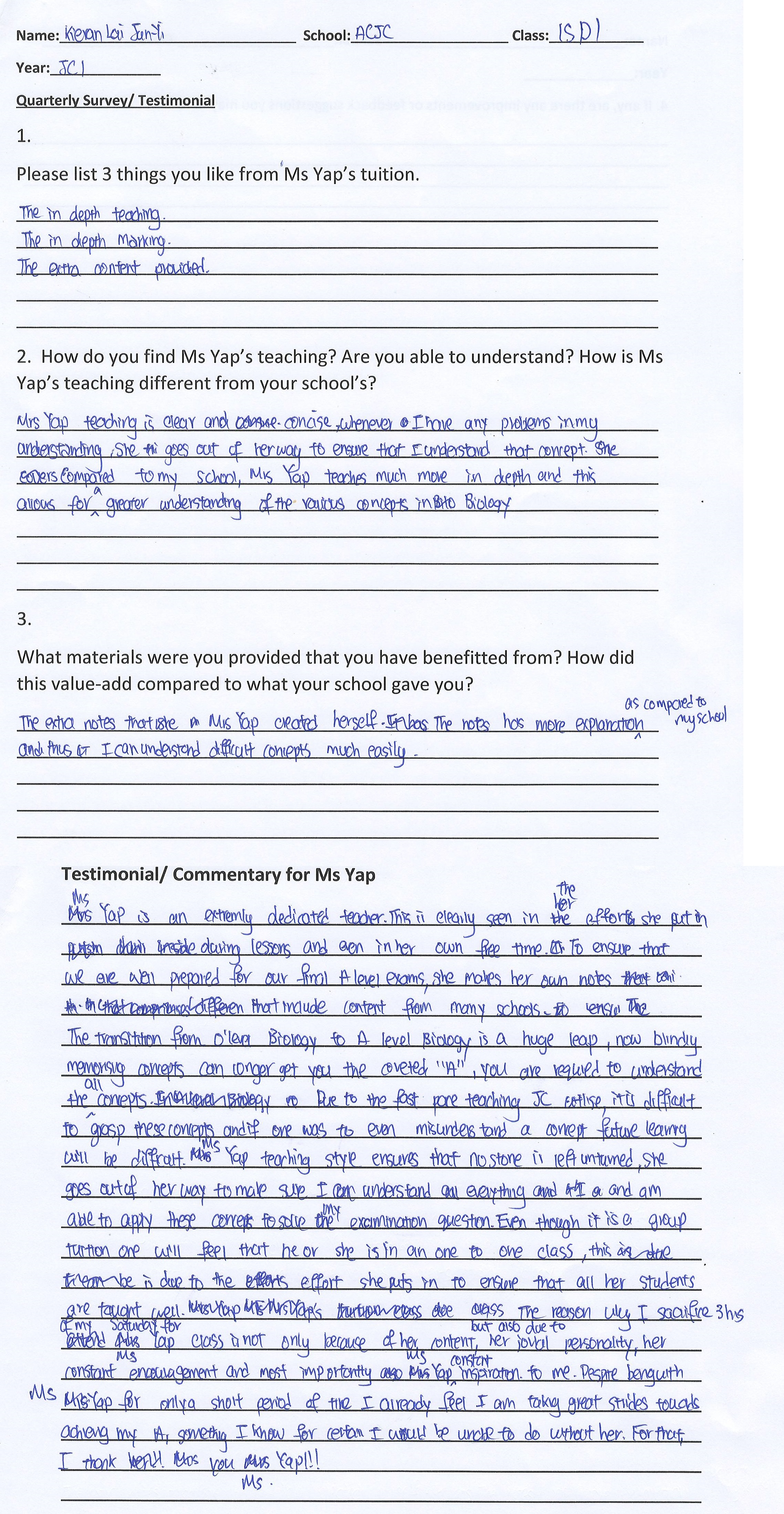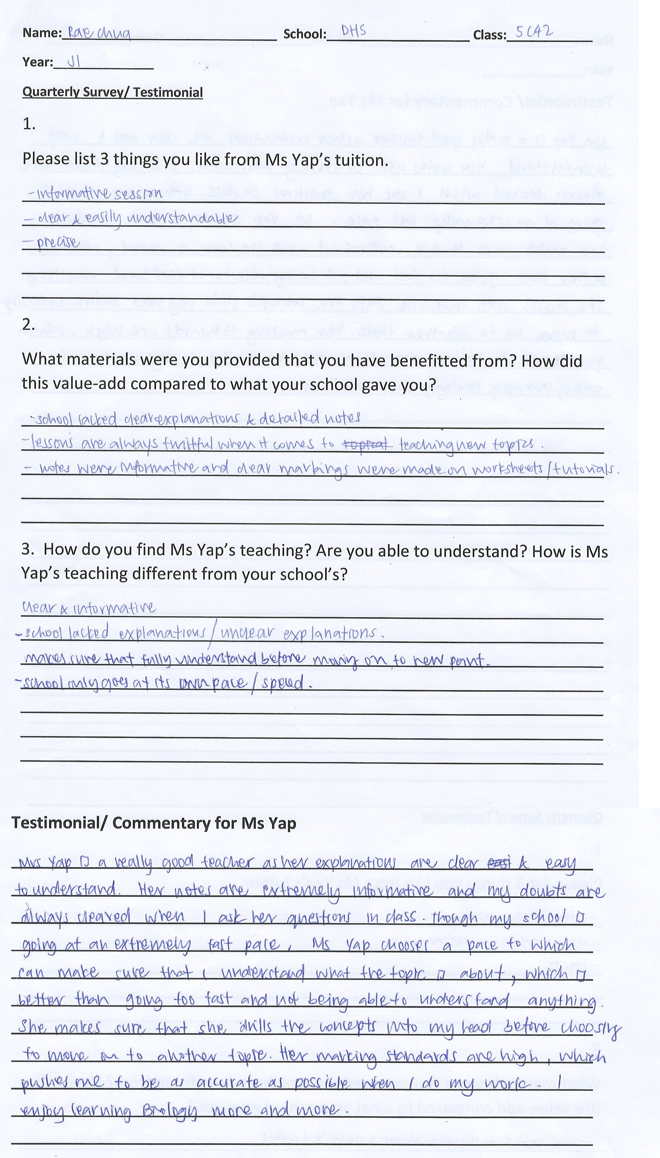 “With no Biology background ( I did not take Biology in Sec 3/4), Ms Yap’s lessons helped my concept application and improve my grades